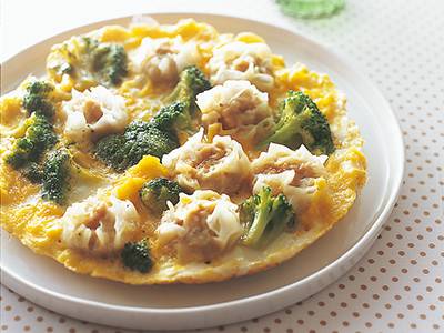 断面のグリンピースがかわいいオムレツは、具だくさんで食べごたえ抜群!新たまねぎの甘みと豚肉のうまみを、卵がきっちりとまとめます。そのまま食べても、好みでトマトケチャップをつけても。