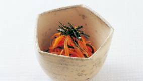 にんじんの副菜は、マンネリになりがち。目先を変え、くるみ酢あえにします。くるみのコクで、にんじんの甘さが引き立ちます。