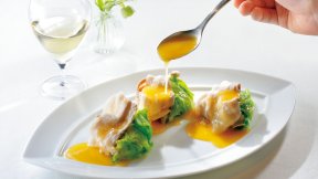 「春霞(はるがすみ)」のイメージでふんわり食感の温かいサラダに仕上げました。柔らかくゆでた牛肉、湯通しで甘さを引き立たせた春野菜、春の苦みのクレソン、それらすべてをごまだれで包み込みます。