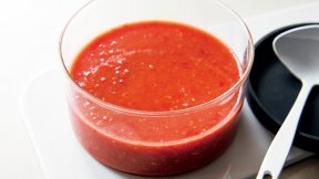 トマトケチャップを手づくりすると、トマトのフレッシュ感が感じられるまろやかな味になります。フルーツトマトを混ぜてソースにし、朝ごはんの卵料理にかけて。このソースは焼いた肉や魚にかけてもおいしい!