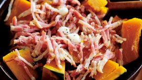 かぼちゃの甘さにスモーキーなベーコンの香りを合わせ、少量の酢で味を引き締めます。ナッツの歯ざわりも楽しい!
