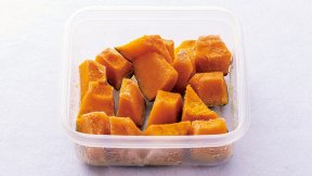 冷凍かぼちゃは必要な分だけ使え、下ごしらえいらずなのでお弁当向きの食材です。電子レンジにかけ、バターをからめて風味をプラス。