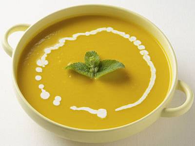 カラフルな食材を組み合わせた色鮮やかなスープです。にんじんは薄く切るとすぐに柔らかくなります。