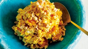 やさしい味に煮たかぼちゃとなめらかな豆腐がよく合い、まるでデザートを食べているよう。ピーナツで香ばしさを加えて。