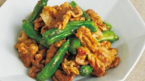 付け合わせのししとうも、肉と一緒に焼いて盛り合わせます。チューブ入りのおろししょうがを使って簡単に!