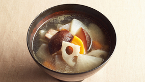 あっさりした昆布だしで、かぼちゃの甘みが際立ちます。ミニトマトの酸味がさわやかなアクセント。