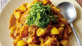 数種類のスパイスを使うインドの野菜の蒸し煮「サブジ」をカレー粉だけで手軽につくりましょう。パクチーは根と茎を煮込み、葉は仕上げに添えてフレッシュな香りをプラスします。