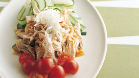 しっとりと柔らかく蒸した鶏むね肉にフレッシュなトマトみょうがだれをかけて。鮮やかな色合いと甘酸っぱさに気分が上がります。