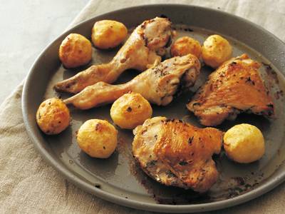 ハーブとにんにくの風味を鶏肉に移してから、フライパンでこんがりと焼きます。じゃがいもは電子レンジで時間短縮。