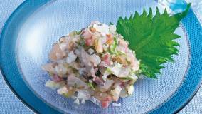 たたいたあじに、みそを加えて香りよく仕上げます。だしをかけた大人味が、大好評です。