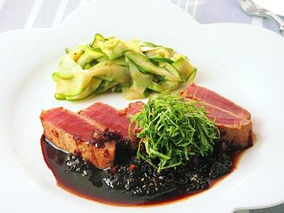 手早くソテーしたまぐろに、ハーブ感覚で青じそをたっぷりのせて。香りを楽しむ一皿です。