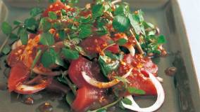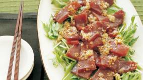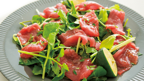 赤身まぐろでつくる、目にも鮮やかなカルパッチョです。決め手はピリリの柚子こしょう。