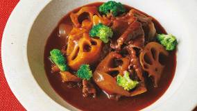 れんこんがゴロゴロ入って、食べごたえ満点。パンにもご飯にもよく合います。れんこんは存在感を出すため皮付きで。柔らかいほうが好みなら、皮をむいて切り、長めに煮てからドミグラスソースを加えるとよいでしょう。