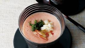 甘酒のやさしい甘みと、トマトのうまみ、アボカドのコクが相性のいい、ミキサーにかけるだけの簡単スープです。