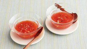 「ガスパチョ」はたくさんの野菜でつくるスペインの冷製スープです。 トマト缶にヨーグルトを加えると少ない材料でも味が広がります。