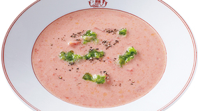 スペインの定番料理・ガスパチョ風の冷たい真っ赤なスープです。ほのかな甘さをと辛みがきいています。