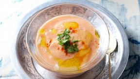 トマトとパン、にんにくなどでつくるスペインのスープ、ガスパチョをすいかでアレンジ。酸味と甘みのバランスがやみつきになります。