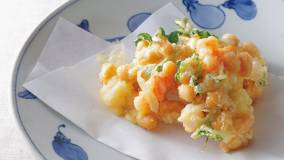 香ばしさと揚げた大豆の食感が楽しめるかき揚げです。衣をからめる前に打ち粉をして、具材をきれいにまとめます。