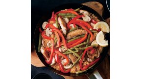 あさりと鶏スペアリブのうまみを生かした、スープいらずのパエリア。具材はぜいたくにどっさりのせましょう。レモンの酸味とおこげの香ばしさがアクセント。