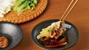 シャキシャキの細ねぎを豚肉でクルッと巻いて蒸し上げます。仕上げにピリ辛だれをタラ~ッとかけて、さあ召し上がれ。