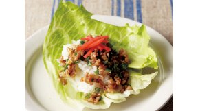 クッタリ柔らかくゆでたひすい色のレタスは、主役級の具材になります。ピリッと辛みをきかせた豚こまを包めば、いくらでも食べられそう。