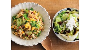 チャーハンは定番の具材にたっぷりのレタスを加えます。副菜はレタスを電子レンジでしんなりさせ、コクのあるソースをかけるだけ。レタス1コをペロリと食べられます。