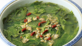 鮮やかなグリーンの正体はきゅうり。あさりをミキサーにかけて加える、うまみたっぷりのスープ。あさりの蒸し汁とともに、たっぷりレタスを召し上がれ。