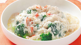 ブロッコリーにスープを含ませて蒸し、ふわトロの卵白あんをかけた定番。かには缶詰でもかにかまぼこでもOKです。