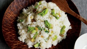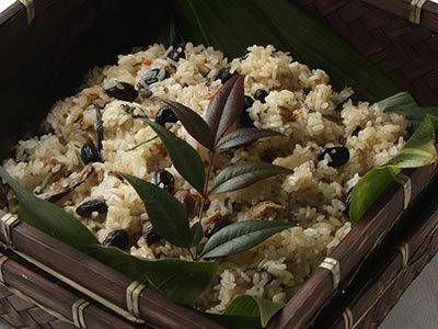 こごみは、アクやくせがなく、手軽に楽しめる山菜。いり卵や焼きしいたけと合わせて、彩りのよい混ぜずしにします。すし飯は木の芽とじゃこを混ぜて、春の香りとうまみをアップさせます。