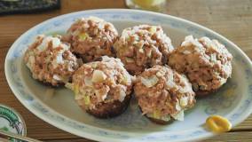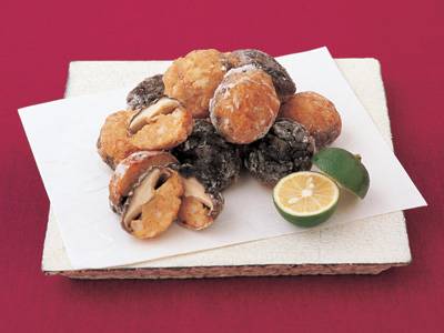 しいたけの形を生かした、かわいらしい揚げ物です。かさに詰めるタネには、色のきれいなえびを使って、見た目にも満足な仕上がりに。