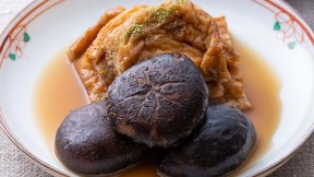 干ししいたけの濃いうまみをたっぷりと味わいます。生麩(ふ)は彩りだけでなく、柔らかな食感でアクセントに。