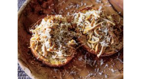 しいたけの軸やベーコン、パセリを混ぜた風味のよいパン粉をたっぷりのせて。オリーブ油がしみてカリカリに焼き上がります。