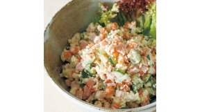 おからパウダーに材料を混ぜるだけで、軽やかなポテトサラダ風になります。加える水や調味料の量と順番がポイントです。