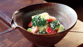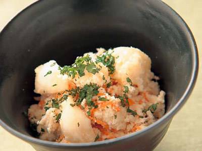 「きらずあえ」は、「うの花あえ」ともいい、うす味のおからをあえ衣にした口当たりがやさしいあえ物。焦がさないようにいるのがこつです。