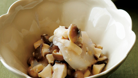 こしょうがきいたパリパリの水菜とうまみたっぷりの帆立てをマヨネーズでまとめたぜいたくなサラダです。ぶぶあられの歯ざわりもよいアクセントに。