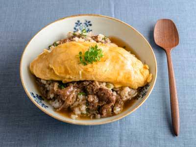 オムライスご飯は、牛肉の甘辛煮を混ぜるだけ!かつおと昆布のあわせだしのきいたあんは、まろやかなおいしさです。
