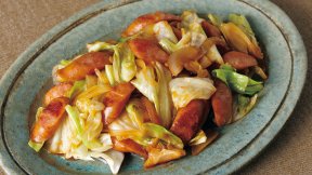 冬キャベツの炒め物は途中でふたをしてしっかり火を通すのがポイント。ソーセージとケチャップでナポリタン風の味わいです。