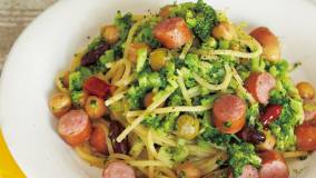 ブロッコリーソースでスパゲッティを煮るだけ。ピリッと心地よい辛さがポイントです。