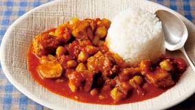 ゴロっとした角切り肉と、ホクホクのひよこ豆のカレー。ルーを使わずに、カレー粉とトマト缶、ヨーグルトで煮込みます。
