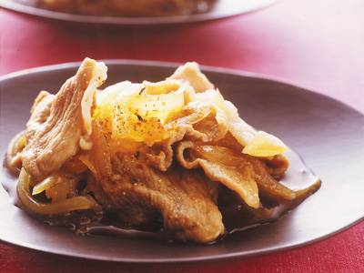 おろしたまねぎ入りのたれをもみ込んだ豚肉がうまみの素(もと)です。たれを吸ったキャベツとさやいんげんもおいしい!