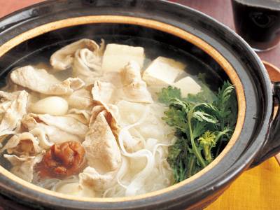 にんにくと梅干しの風味をきかせただけのあっさりとした「ちり鍋」に、柚子こしょうのたれを添えて。