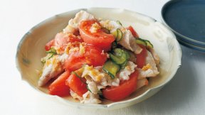 初夏の冷しゃぶはトマトだれで華やかに仕上げましょう。スープは豚肉のうまみを利用し、豆と野菜で栄養満点です。