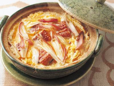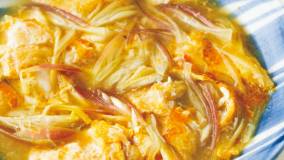 卵と油揚げのやさしい味わいが、すっきりとしたみょうがの風味を引き立てます。みょうがは香りを生かすため、2回に分けて入れるのがポイント。