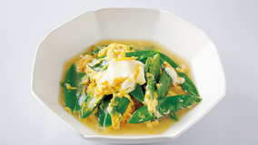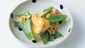 たっぷりの絹さやを色よく煮て、歯ごたえを残して、卵でふんわりまとめます。絹さやの甘みとしらす干しの塩けが絶妙の相性です。