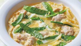 フワフワのつくねと歯ざわりのよい絹さやを卵でとじた、やさしいおかず。ひき肉のタネも溶き卵もゆるめにして煮汁に加えるのがポイント。