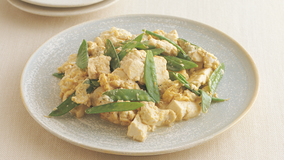 うす味の煮汁で煮たたけのこと、色よくゆでた絹さやを、卵がふんわりと包み込む一品です。