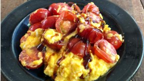 卵にマヨネーズを混ぜてふんわりとした食感に。ミニトマトは直径が短いほうを切ると、種が出にくく水っぽくなりません。