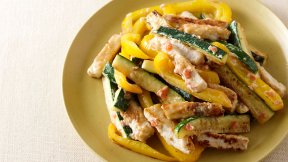 蒸し煮にしたパプリカは甘くてジューシー。スナップえんどうと大きさを合わせて切り、歯ざわりの違いを楽しみましょう。