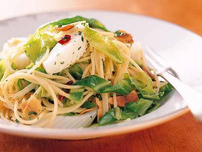 柔らかなやりいかに、サッと炒めたキャベツがシャキシャキ。シンプルなにんにく風味の味つけで素材の味を引き立てます。