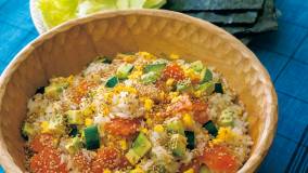 5種類の豆を使ったぜいたくなちらしずし。酢ではなくレモンを使った爽やかな風味で、豆の個性を存分に味わいましょう。